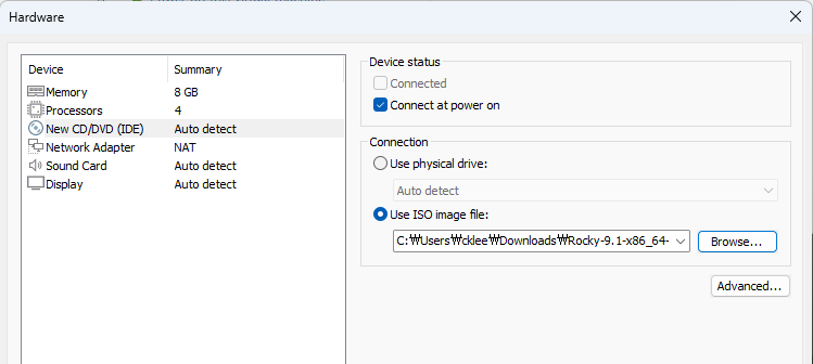 Use ISO image file에 다운로드 받았던 ISO 파일을 선택합니다.