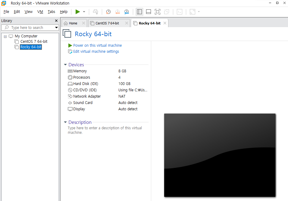 이제 기본 세팅은 끝이 났고 구성한 vmware를 실행합니다.