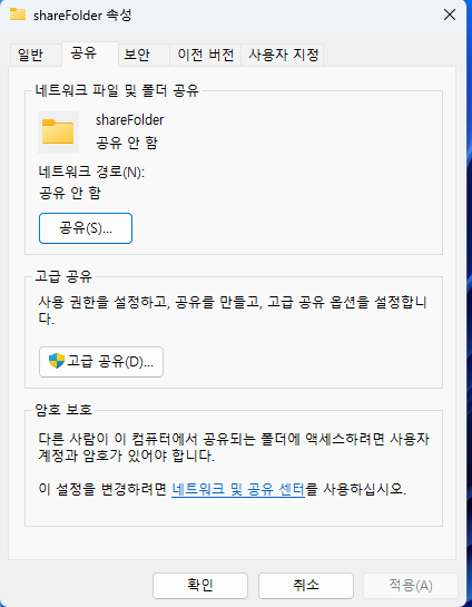 속성에서 공유 탭을 선택한 후 중간에 고급 공유를 선택합니다.