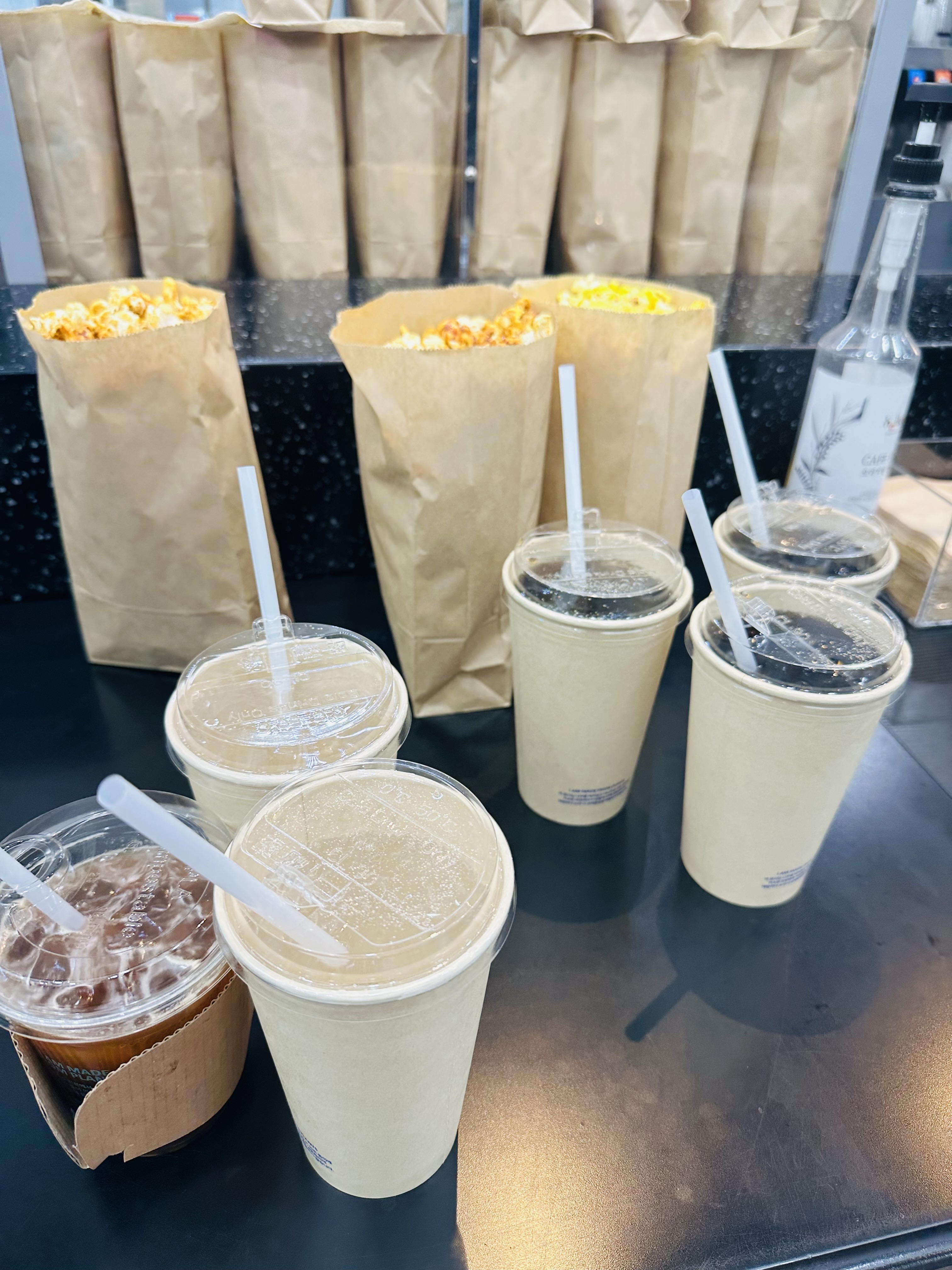 (TMI 친환경소재사용으로 팝콘봉투가 종이라서 바스락거리는 소리가 나요; 저는 따로 종이커피컵가져가서 애들 소분해줬어요^^)