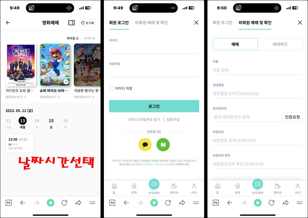 >>> 날짜&시간 선택 >>> 회원로그인 or 비회원 예매 및 확인