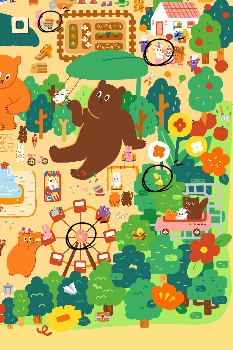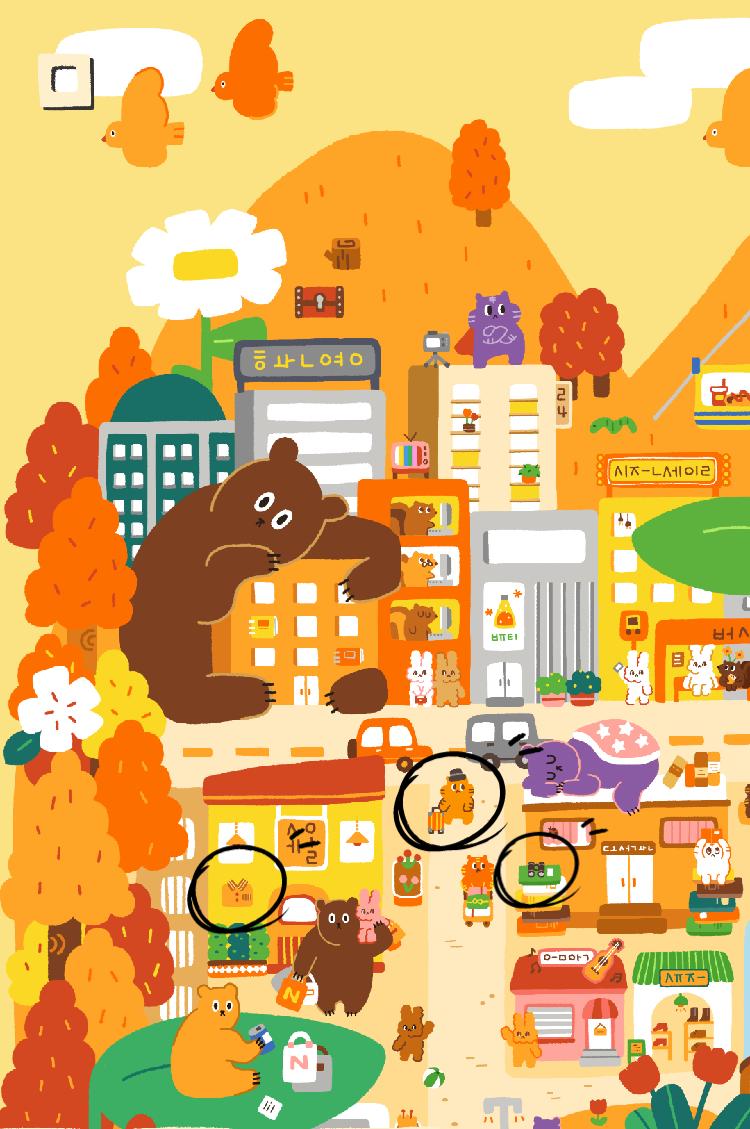 배경이 화려해서 검정색 동그라미로 찾는 대상들을 표시해 두었습니다.