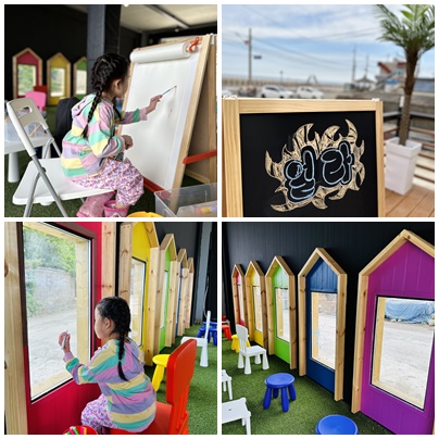 외벽에도 드로잉할 수 있는 보드가 되어있어서 물감으로 칠하고 찍고 뿌리고