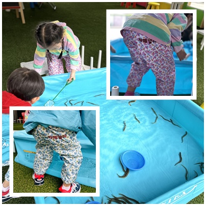 이미 미꾸라지를 잡고있는 아이들에게 방수바지를 입혔어요~