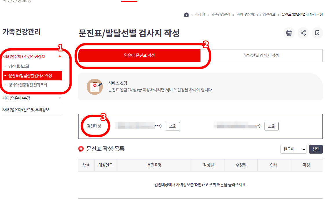 - 좌측에 건강검진대상조회가 기본적으로 선택되어있고 본문부분 검진대상옆에 조회 클릭. > 하단 문진표작성 or 발달선별검사지 작성 클릭( 보통 문진표작성을 먼저하지만 순서는 상관없어요)