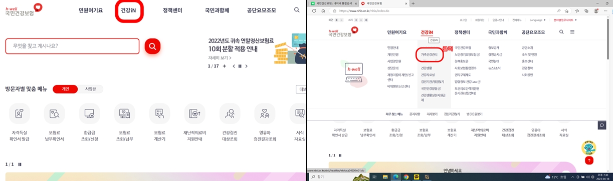 - 상단 메뉴 중 "건강in" 에 마우스를 대면 아래로 열리는 리스트 중 "가족건강관리" 클릭.