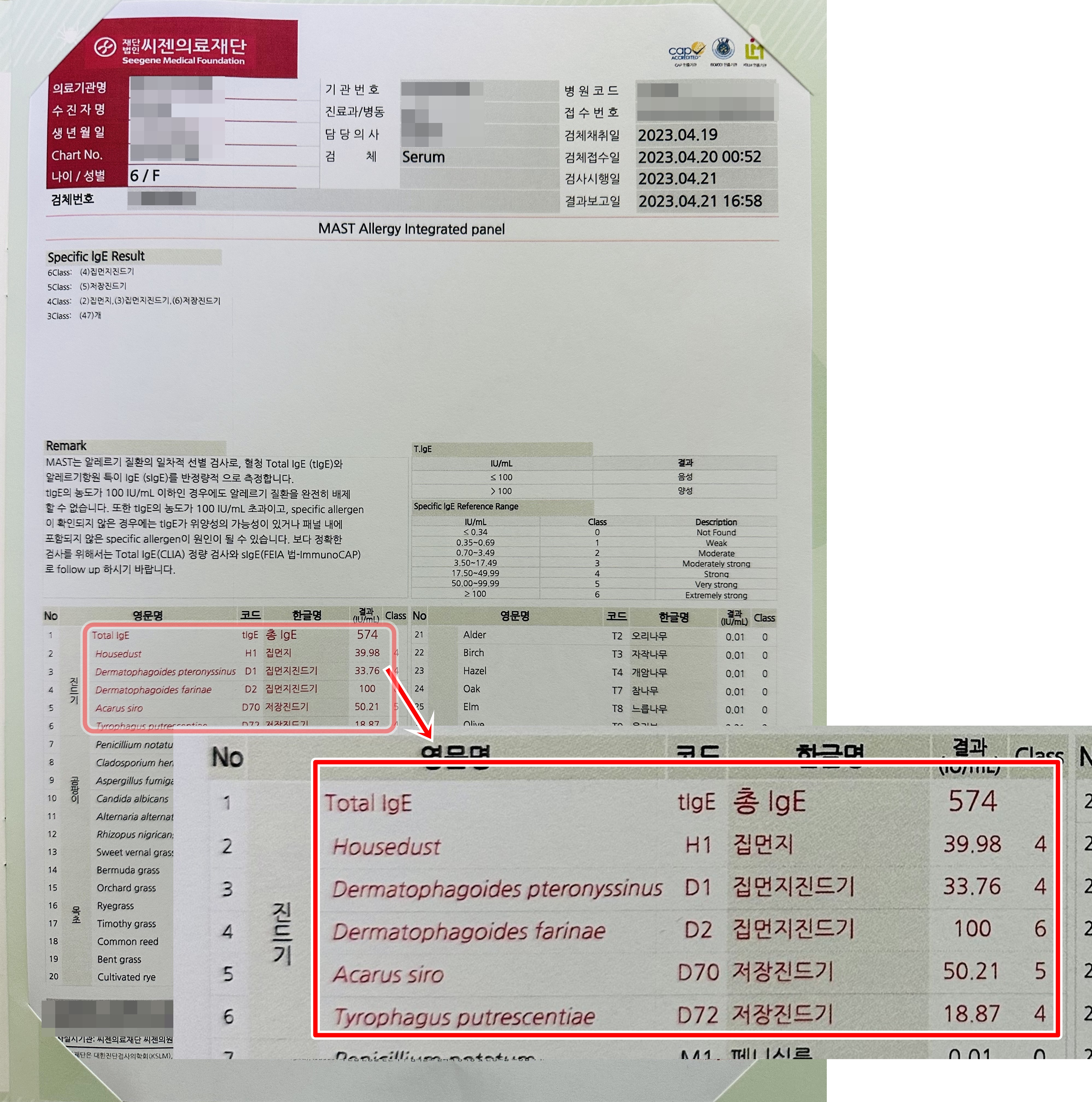 검사 결과 진드기에 대한 반응이 클래스 6까지 나올정도로 높았어요.
