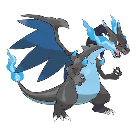 메가리자몽 X 생태 : 리자몽이 진화했다. 몸은 검고 불꽃은 더욱 온도가 높아져 파랗게 변화했다.