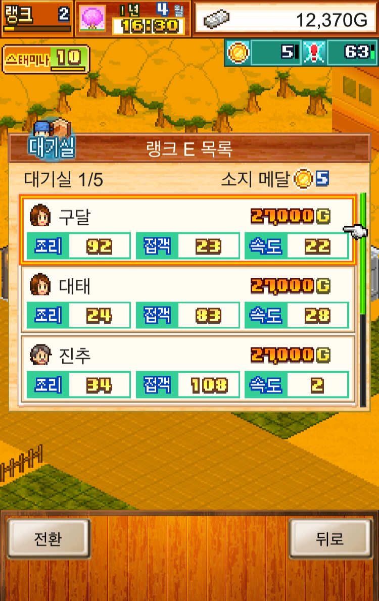 벌어들인 수익과 메달로 더 좋은 랭크의 직원을 고용할 수 있습니다.